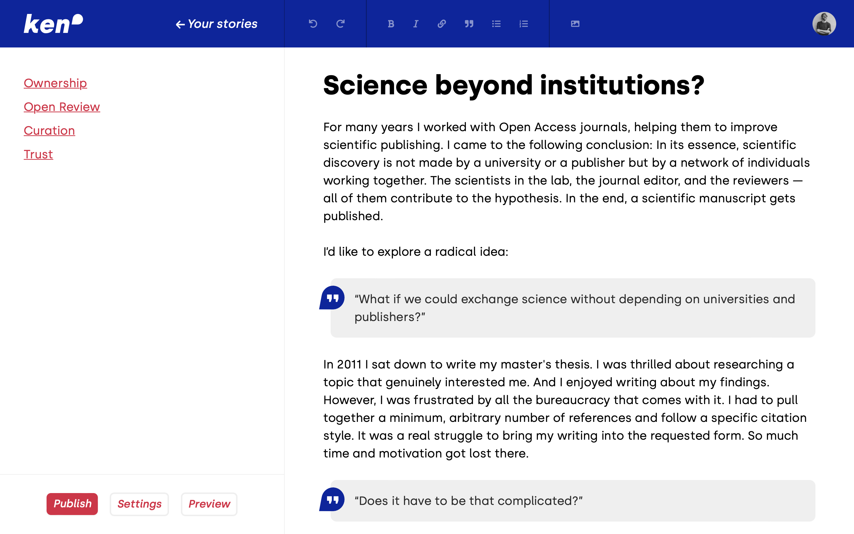 Be honest, not perfect. All stories on Ken are considered works in progress. They improve over time through public conversation.